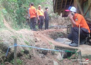Tim Badan Penangulangan Bencana Daerah (BPBD) Kabupaten Tasikmalaya di dampingi oleh Kordinator lapangan (Korlap) Relawan Penanggulangan Bencana (RPB) Kecamatan Sukahening dan perangkat Desa Banyurasa, meninjau lokasi bencana alam pergerakan tanah di Kampung Saribudi Desa Banyurasa Kecamatan Sukahening Kabupaten Tasikmalaya Provinsi Jawa Barat, Selasa (30/07/2019).