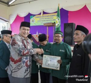 Wali Kota Tasikmalaya Drs. H. Budi Budiman secara simbolis menyerahaka gerobak juga Kompas Arah Kiblat kepada salah satu perwakilan pengurus DKM.