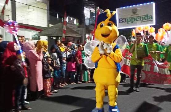 Ditengah iring-iringan peserta pawai, Maskot Pajak yang ditampilkan oleh rombongan Bappenda memiliki warna lebah kuning nampak paling menarik dan menyita perhatian masyarakat yang menyaksikannya.