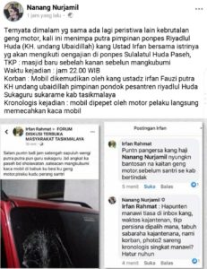“Korban: Mobil dikemudikan oleh kang Ustadz Irfan Fauzi putra KH. Undang Ubaidillah pimpinan Pondok Pesantren Riyadlul Huda Sukaguru, Sukarame, Kab. Tasikmalaya. Kronologis kejadian: Mobil dipepet oleh motor pelaku langsung memecahkan kaca mobil,” paparnya.