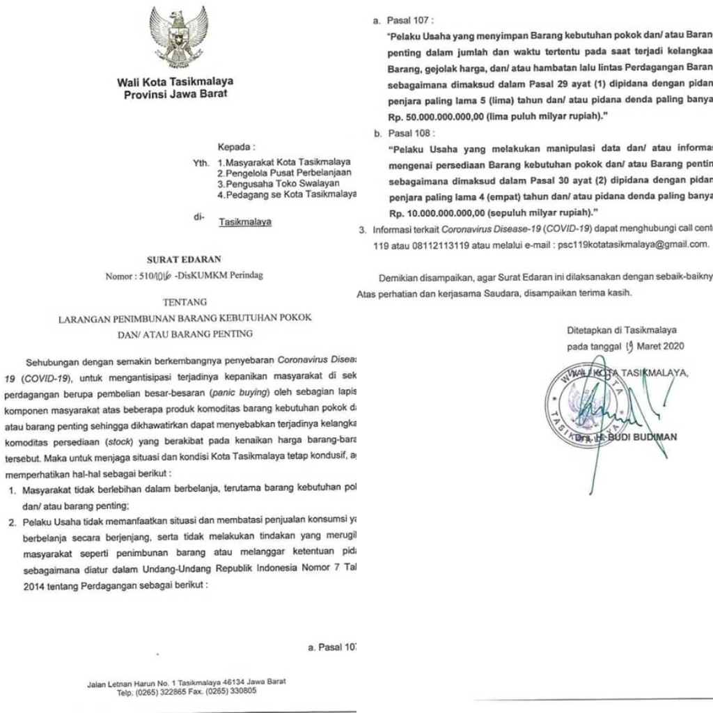 Pemerintah Kota (Pemkot) Tasikmalaya telah menerbitkan Surat Edaran Walikota Tasikmalaya Nomor 510 / 1016 -DisKUMKM Perindag tentang Larangan Penimbunan Kebutuhan Pokok dan atau Barang Penting.