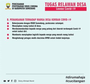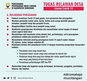 “Pemkab (Pemerintah Kabupaten) Sumedang meminta kepada para kepala desa untuk membentuk RELAWAN DESA LAWAN COVID-19,” tegasnya.