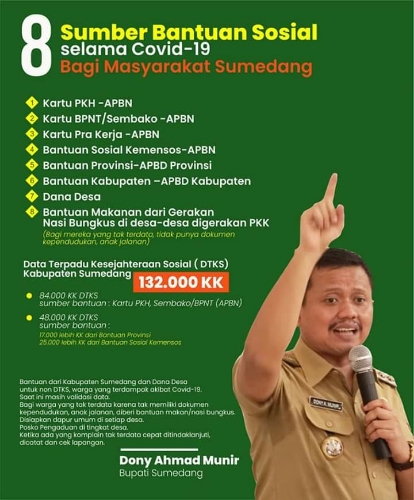 Dikatakan Dony, Data Terpadu Kesejahteraan Sosial ( DTKS) Kabupaten Sumedang ada 132.000 KK yang harus mendapat bantuan. Warga yang masuk DTKS ini diberi bantuan dari pemerintah pusat dan provinsi.