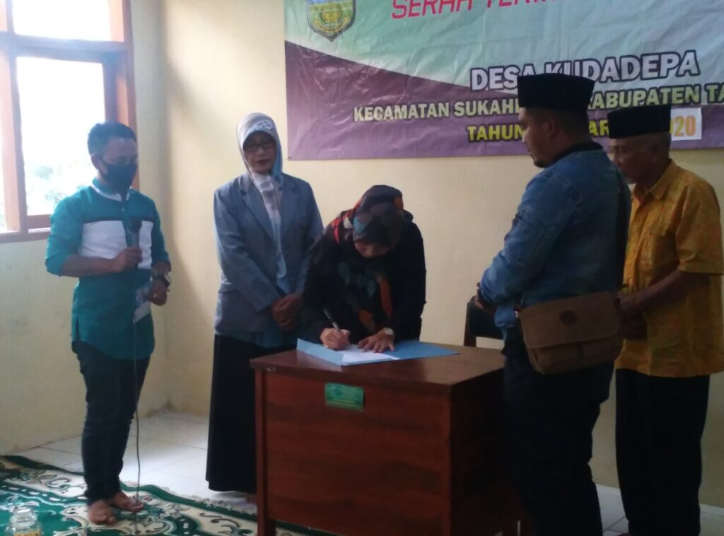 Acara dilanjutkan dengan penandatanganan berita acara serah terima pekerjaan oleh Kades Kudadepa Yeni Nurmala, S.IP, Ketua BPD Ny. Iin Waskinah, S.Pd.I, Ketua TPK, Kepala Sekolah MDT Ma’rifatul Huda Dudus, S.Ag, dan DKM, serta peresmian oleh Kades Yeni Nurmala. [Fauzi]