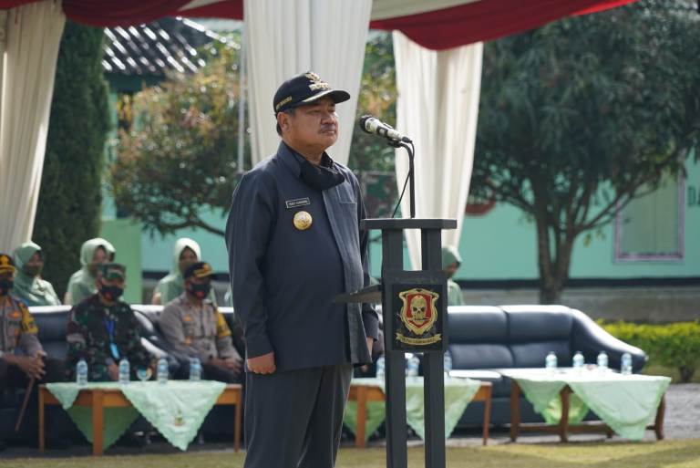 Bupati Garut, H. Rudy Gunawan, SH., MH., MP, bertindak sebagai inspektur upacara, di Lapang Upacara Yonif Raider 303/SSM/12/1 Kostrad, Kecamatan Cisurupan, Kabupaten Garut, Provinsi Jawa Barat, Minggu (26/07/2020).