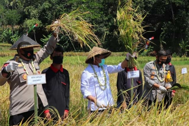 Inovatif89.com – Bupati Sumedang bersama Direktur Binmas Polda Jabar, Kapolres Sumedang dan lainnya melakukan panen raya padi setelah kegiatan penetapan Kampung Tohaga Lodaya Desa Linggajaya, Kecamatan Cisitu, Kabupaten Sumedang, Provinsi Jawa Barat, Rabu (29/07/2020).