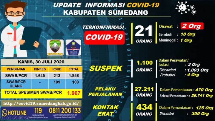 Inovatif89.com – Bupati Sumedang mengatakan, setelah menjalani perawatan dan isolasi di RSUD Sumedang sejak 25 Juli 2020, pasien nomor 19 seorang ibu berusia 49 tahun asal Kecamatan Jatinangor bisa pulang berkumpul lagi dengan keluarganya, Kamis 30 Juli 2020.