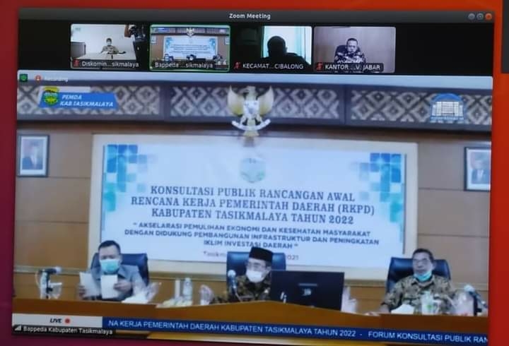 INOVATIF89.COM , TASIKMALAYA — Pemerintah Daerah (Pemda) Kabupaten Tasikmalaya melalui Badan Perencanaan dan Pembangunan Daerah (Bappeda) mengadakan konsultasi publik rancangan awal Rencana Kerja Pemerintah Daerah (RKPD) Kabupaten Tasikmalaya Tahun 2022 secara virtual melalui video conference yang diadakan di Aula Wiradadaha, Kamis (21/01/2021). Acara kunsultasi publik tersebut mengusung tema “Akselerasi Pemulihan Ekonomi dan Kesehatan Masyarakat Dengan Didukung Pembangunan Infrastruktur dan Peningkatan Iklim Investasi Daerah”.