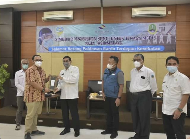 Secara simbolis penyerahan kunci 50 kamar hotel Harmoni untuk 100 tenaga tersebut diserahkan oleh Kepala Bagian Rumah Tangga Biro Umum Setda Provinsi Jawa Barat Drs. H. Jejen Hendra Permana, M.Si kepada Plt Walikota Tasikmalaya Drs. H. Muhammad Yusuf dan selanjutnya diserahkan kepada dr. Dani selaku perwakilan dari tenaga kesehatan Kota Tasikmalaya.