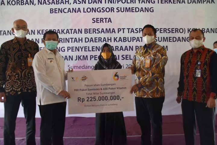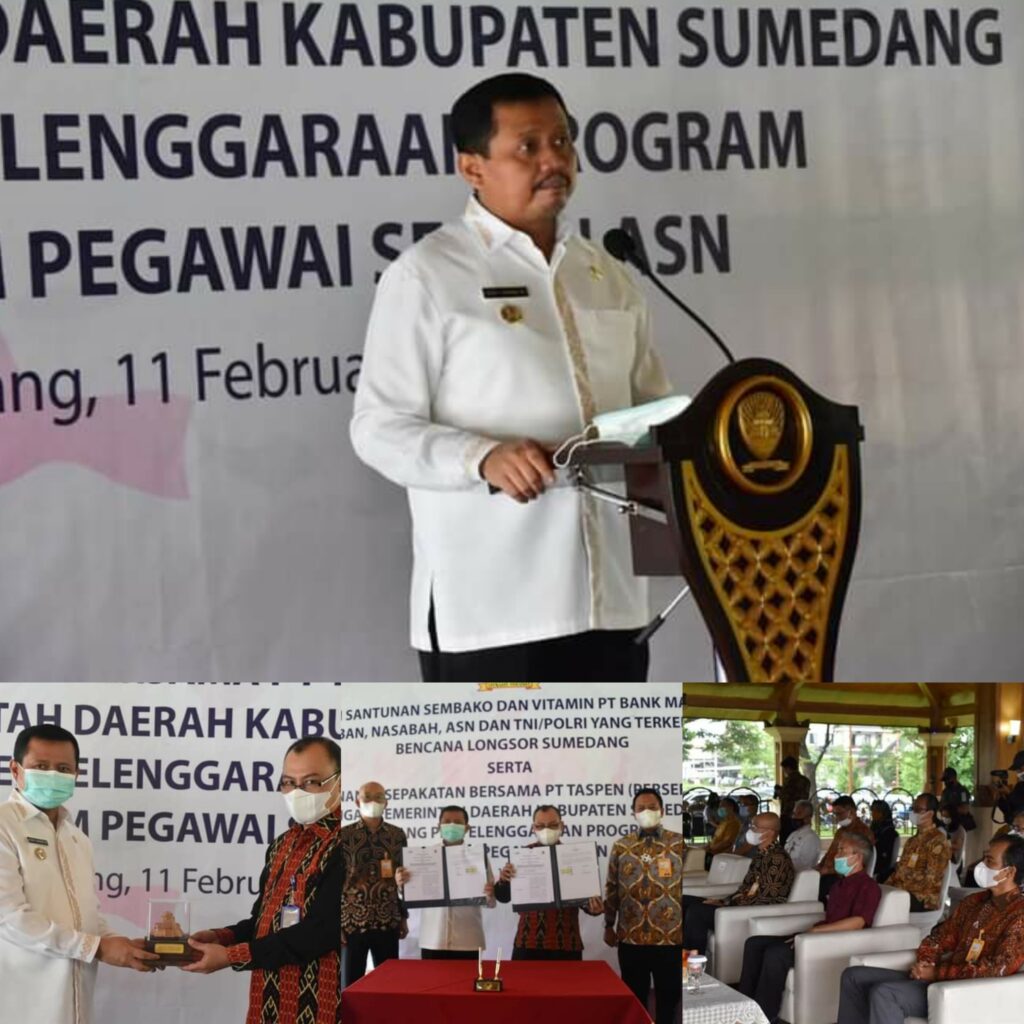 Inovatif89.com, SUMEDANG — Bupati Sumedang Dr. H. Dony Ahmad Munir, ST., MM, menghadiri kegiatan penyerahan santunan sembako dan vitamin dari PT. Bank Mandiri Taspen bagi nasabah ASN dan TNI/Polri yang terkena dampak bencana longsor di Cimanggung Sumedang sekaligus penandatanganan kesepakatan bersama PT. Taspen (Persero) KCU Bandung dengan Pemerintah Daerah Kabupaten Sumedang tentang penyelenggaraan program JKK dan JKM Pegawai selain ASN, bertempat di Aula Pendopo IPP (Induk Pusat Pemerintahan) Kabupaten Sumedang Provinsi Jawa Barat, Kamis (11/02/2021).