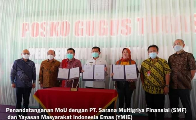 Inovatif89.com, SUMEDANG — Bertempat di Pendopo Induk Pusat Pemerintahan (IPP) Kabupaten Sumedang, Pemerintah Daerah (Pemda) Kabupaten Sumedang melakukan Penandatanganan Nota Kesepahaman (MoU) bersama dengan PT. Sarana Multigriya Finansial (SMF) dan Yayasan Masyarakat Indonesia Emas (YMIE) dalam Pengembangan Pariwisata Daerah dan UMKM serta Pembinaan Pariwisata dan UMKM di Kabupaten Sumedang Provinsi Jawa Barat, Kamis (11/02/2021).
