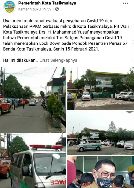 Melaui akun facebook Pemerintah Kota Tasikmalaya, Plt Wali Kota Tasikmalaya Drs. H. Muhammad Yusuf usai memimpin rapat evaluasi penyebaran Covid-19 dan Pelaksanaan PPKM berbasis mikro di Kota Tasikmalaya menyampaikan, bahwa Pemerintah melalui Tim Satgas Penanganan Covid-19 telah menerapkan Lock Down pada Pondok Pesantren Persis 67 Benda Kota Tasikmalaya, Senin 15 Februari 2021.