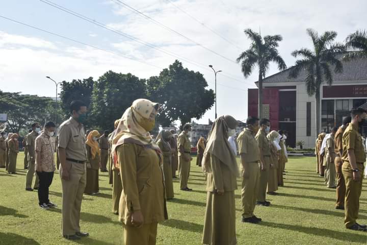 TASIKMALAYA — Bertempat di Lapangan Upacara Bale Kota Tasikmalaya Provinsi Jawa Barat, belasan Pegawai Negeri Sipil (PNS) Kota Tasikmalaya Tanggal Mulai Tugas (TMT) Maret 2021 menerima Surat Keputusan (SK) Pensiun, Senin (01/03/2021).