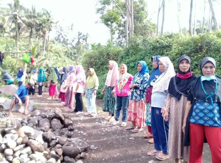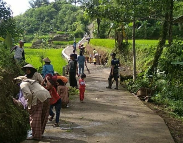 Masyarakat sangat antusias membersihkan sampah dengan membawa sapu dan pengki yang terbuat dari anyaman bambu, dihiasi dengan suasana penuh keakraban dan keharmonisan antara Kepala desa dengan masyarakat.