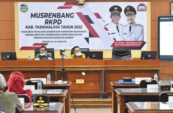 TASIKMALAYA — Bertempat di Aula Wiradadaha Badan Perencanaan Pembangunan Daerah (Bappeda) Kabupaten Tasikmalaya Provinsi Jawa Barat, Pemerintah Daerah (Pemda) melalui Bappeda menyelenggarakan Musyawarah Perencanaan Pembangunan (Musrenbang) Rencana Kerja Pemerintah Daerah (RKPD) Kabupaten Tasikmalaya Tahun 2022, Kamis (18/03/2021).