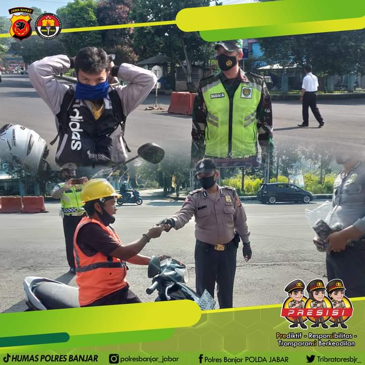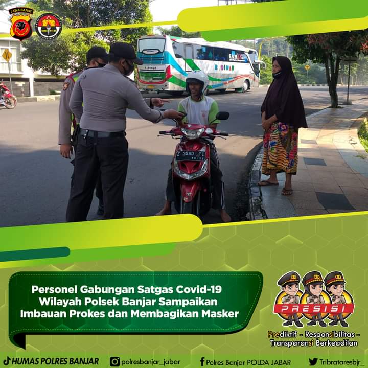 KOTA BANJAR — Melalui Satpol PP Kota Banjar bersama dengan TNI, Polri dari jajaran anggota Polsek Banjar, Satgas Covid 19 Kecamatan Banjar berjumlah sebanyak 13 orang, menggelar Patroli gabungan penegakan Protokol kesehatan (Prokes) terkait pencegahan dan penyebaran virus Covid-19 dengan cara mobile dan membagikan masker gratis.