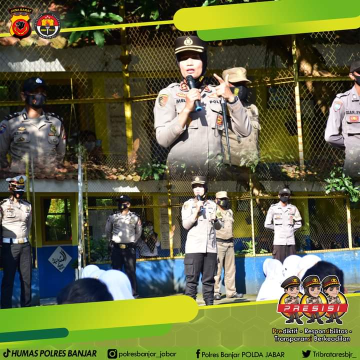 KOTA BANJAR — Kepala Kepolisian Resor (Kapolres) Banjar AKBP. Melda Yanny, S.IK., MH, didamingi Kasat Lantas, Kasat Binmas serta Personel Polres Banjar dan Bhabinkamtibmas menyambangi SMP Negeri 6 Kota Banjar di Dusun – Desa Jajawar Kecamatan Banjar Kota Banjar Provinsi Jawa Barat, melaksanakan Pembelajaran Tatap Muka (PTM) terbatas, Kamis (18/03/2021).