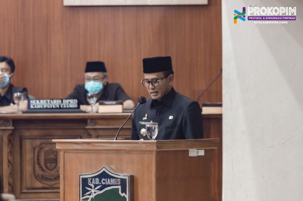 CIAMIS — Pemerintah Kabupaten Ciamis menyampaikan nota pengantar Laporan Keterangan Pertanggung Jawaban (LKPJ) tahun anggaran 2020 sebanyak 163 program dan 2.142 kegiatan dalam acara rapat paripurna DPRD, bertempat di ruang rapat paripurna DPRD Kabupaten Ciamis Provinsi Jawa Brat, Jum’at (26/032021.
