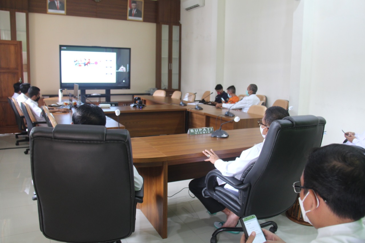 CIAMIS — Bupati Ciamis Herdiat Sunarya didampingi Sekda Dr. Tatang, M.Pd, dan OPD terkait lainnya mengikuti rapat komite penanganan Covid 19 dan Pemulihan Ekonomi Daerah (PED) Jawa Barat secara virtual bersama Gubernur Jawa Barat H. Mochammad Ridwan Kamil, ST., M.Ud, dari Ruang Vidcon Setda Kabupaten Ciamis, Rabu (14/04/2021). Rapat tersebut juga diikuti oleh Bupati/Walikota se-Provinsi Jawa Barat