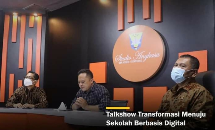 SUMEDANG — Kepala Dinas Pendidikan Agus Wahidin, S.Pd., M.Si, bersama Kepala Sekolah SMP Negeri 1 Sumedang Asep Ruhendi melaksanakan Talkshow dengan tema “Transformasi Menuju Sekolah Berbasis Digital”, bertempat di Studio Angkasa SMP Negeri 1 Sumedang Provinsi Jawa Barat, Jum’at (16/04/2021).