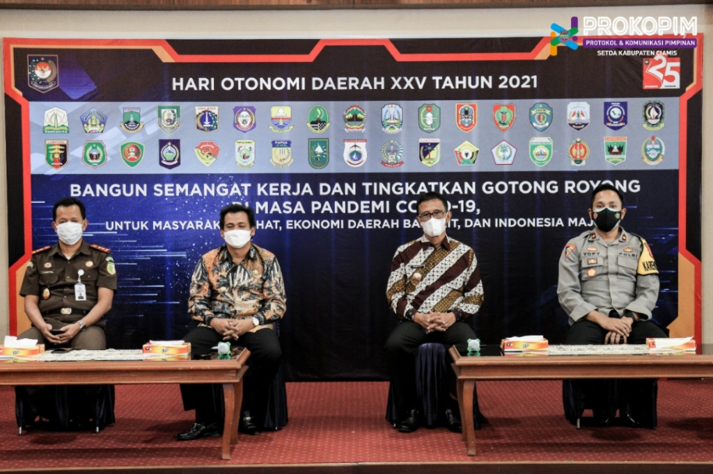 CIAMIS — Bertempat di Aula Setda Kabupaten Ciamis Provinsi Jawa Barat, Bupati Herdiat Sunarya mengikuti acara peringatan hari otonomi daerah (OTDA) ke-25 tingkat nasional dengan mengusung tema “Bangun Semangat Kerja Dan Gotong Royong Di Masa Pandemi Covid-19, Untuk Masyarakat Sehat, Ekonomi Daerah Bangkit dan Indonesia Maju” secara virtual, Senin (26/04/2021).