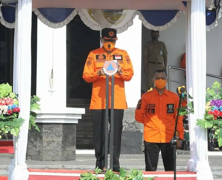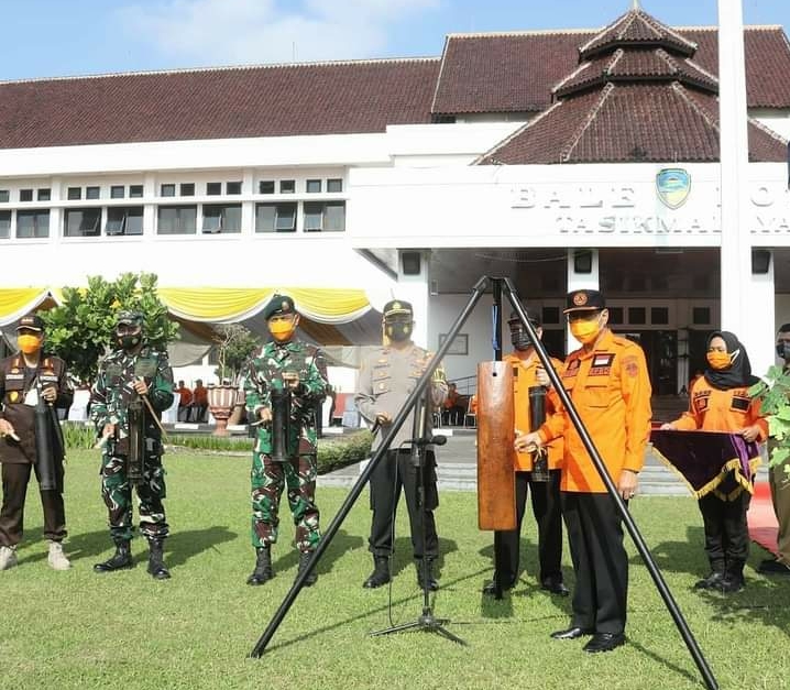 TASIKMALAYA — Plt. Walikota Drs. H. Muhammad Yusuf menghadiri apel puncak peringatan Hari Kesiapsiagaan Bencana (HKB) Tahun 2021 tingkat Kota Tasikmalaya, bertempat di Halaman Bale Kota Tasikmalaya Provinsi Jawa Barat, Senin (26/04/2021).