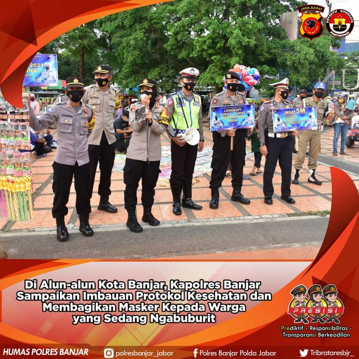 BANJAR — Kepala Kepolisian Resor (Kapolres) Banjar AKBP. Melda Yanny, S.IK., MH, bersama Wakapolres, Para Kasat, dan Personel serta Sat Pol PP mengedukasi serta sosialisasikan protokol kesehatan (Prokes) dan kebijakan pemerintah terkait larangan mudik kepada masyarakat di Alun-alun Kota Banjar Provinsi Jawa Barat, Jum’at (30/04/2021) sore.