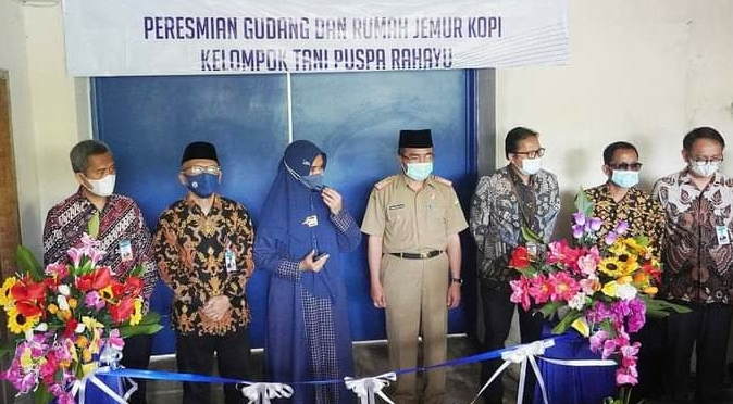 Sekda Kab. Tasikmalaya Mohamad Zen (tengah) didampingi Anggota DPR RI Komisi XI Siti Mufattahah (ketiga dari kiri), Deputi BI Jabar, Kepala Perwakilan BI Cirebon, Kepala BI Kantor Perwakilan, dan Wakil Ketua DPRD Eri Purwanto saat peresmian gedung dan rumah kopi Kelompok Tani Pusparahayu. Foto/dok. Diskominfo Kab. Tasikmalaya. /Inovatif89.com/Fauzi.