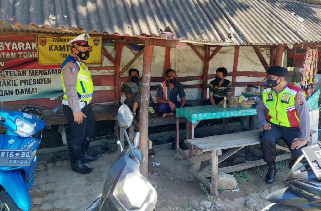 SUMDANG — Polsek Tomo melaksanakan Patroli Dialogis secara mobile dengan menyambangi warga masyarakat yang sedang berkerumun di tempat-tempat di Wilayah Kecamatan Tomo, Kabupaten Sumedang, Provinsi Jawa Barat, Senin (14/06/2021).