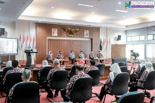 Bupati Ciamis Herdiat Sunarya didampingi para pejabat terkait mengikuti peringatan Harganas secara virtual di Aula Sekretariat Daerah Kabupaten Ciamis. Foto/dok : Humas Ciamis. //Fauzi.