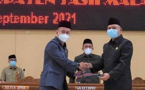 Ketua DPRD Kab. Tasikmalaya Asep Sopari Al Ayubi, SP, (kanan) menyerahkan berita acara persetujuan antara Pemda dan DPRD Kabupaten Tasikmalaya 'telah ditanda tangani' kepada Wabup H. Cecep Nurul Yakin (kiri). Foto/dok : Diskominfo Kab. Tasikmalaya. //Juranilis - Fauzi