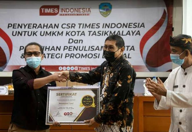 TASIKMALAYA — Walikota Tasikmalaya Drs. H. Muhammad Yusuf menerima penghargaan anugerah Times Indonesia sebagai Man Of The Year Priangan Timur 2020, dalam rangkaian acara penyerahan Corporate Social Responsibility (CSR) Times Indonesia untuk UMKM Kota Tasikmalaya dan Pelatihan Penulisan Berita dan Strategi Promosi Digital, bertempat di Aula Bale Kota Tasikmalaya, Provinsi Jawa Barat, Kamis (07/10/2021). Dengan tetap menerapkan protokol kesehatan.