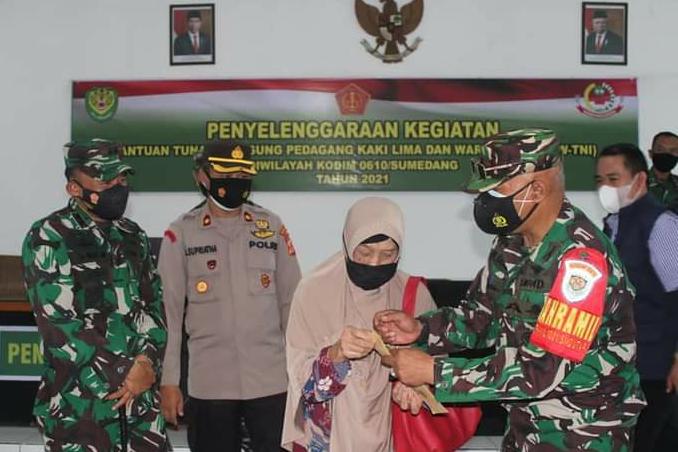 SUMEDANG — Bertempat di halaman Makodim 0610 Sumedang, TNI dan Polri melaksanakan launching penyaluran program Bantuan Tunai Pedagang Kaki Lima dan Warung (BT-PKLW) di Kabupaten Sumedang, Provinsi Jawa Barat, Sabtu (09/10/2021).