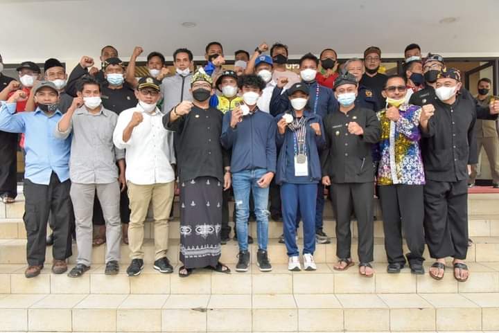TASIKMALAYA — Bupati H. Ade Sugianto, S.IP, dan Wakil Bupati Tasikmalaya H. Cecep Nurul Yakin, S.Pd., M.AP, menerima atlet Kabupaten Tasikmalaya yang telah meraih medali di Pekan Olahraga Nasional (PON) XX Papua, bertempat di Sekertariat Daerah Kabupaten Tasikmalaya, Provinsi Jawa Barat, Selasa (12/10/2021).