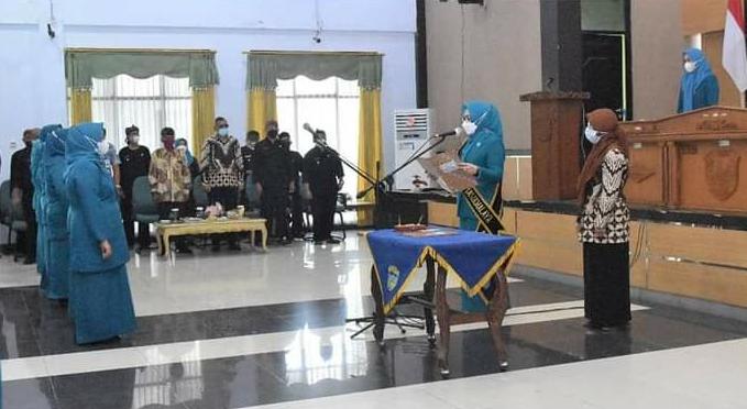 INOVATIF89.COM, TASIKMALAYA – Ketua Tim Penggerak Pemberdayaan dan Kesejahteraan Keluarga (TP PKK) Kabupaten Tasikmalaya Hj. Ai Diantani Sugianto, SH., M.Kn, melantik Ketua TP PKK Kecamatan, Bunda PAUD, Bunda Genre, Bunda Literasi, Bunda FAD, Ketua Forikan se-Kabupaten, serta mengukuhkan dan melantik Pengurus Dekranasda Kabupaten periode 2021-2026, bertempat di Pendopo Baru Kabupaten Tasikmalaya Jabar, Selasa (15/12/2021).