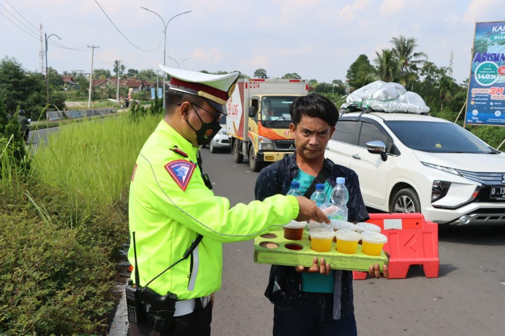 INOVATIF89.COM, TASIKMALAYA – Sat Lantas Polres Tasikmalaya membagikan air mineral dan menghibur pemudik ditengah kepadatan arus lalu lintas (Lalin) di Jalan Raya Tasik – Garut tepatnya di Al Furqon Kecamatan Singaparna Kabupaten Tasikmalaya Jawa Barat, Sabtu (08/05/2022).