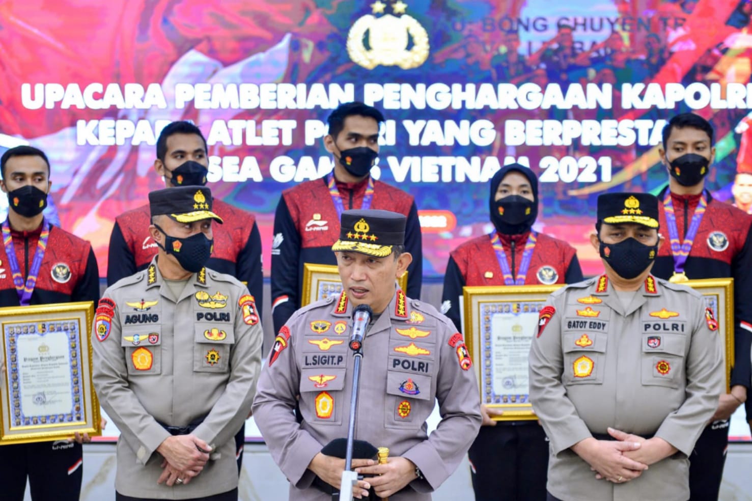 JAKARTA – Kapolri Jenderal Listyo Sigit Prabowo memberikan penghargaan sebagai bentuk apresiasi kepada personel Polri sebagai atlet yang telah menyumbangkan medali emas, perak dan perunggu untuk Indonesia dalam perhelatan Sea Games Vietnam.