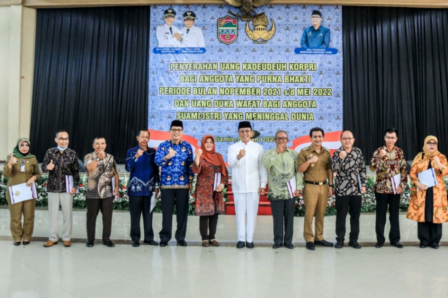 CIAMIS – Bupati Ciamis Herdiat Sunarya menyerahkan secara simbolis uang kadeudeuh bagi anggota KORPRI yang Purna Bhakti periode Nopember 2021 sampai dengan Mei 2022, bertempat di Gedung Islamic Center Ciamis Jawa Barat, Selasa (07/06/2022).