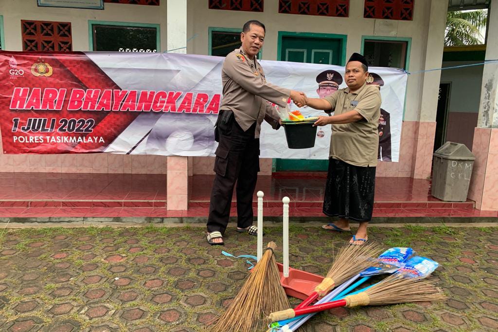 Selain kegiatan Baksos, Kapolsek juga memberikan bantuan berupa alat-alat kebersihan yang diterima oleh Ketua DKM Mesjid Jamie Al Huda Aj. Karnudin S.Ag.