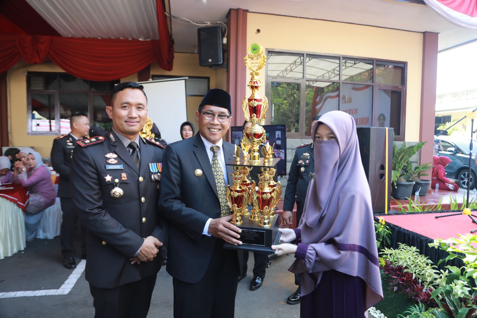 Walikota Tasikmalaya Drs. H. Muhammad Yusuf didampingi Kapolres Tasikmalaya Kota AKBP Aszhari Kurniawan, S.H., S.I.K., M.Si. menyerahkan secara langsung kepada para Juara Lomba Tahfidz Qur’an saat menghadiri Syukuran Hari Bhayangkara ke -76 di Mapolres Tasikmalaya Kota, Selasa (05/07/2022).