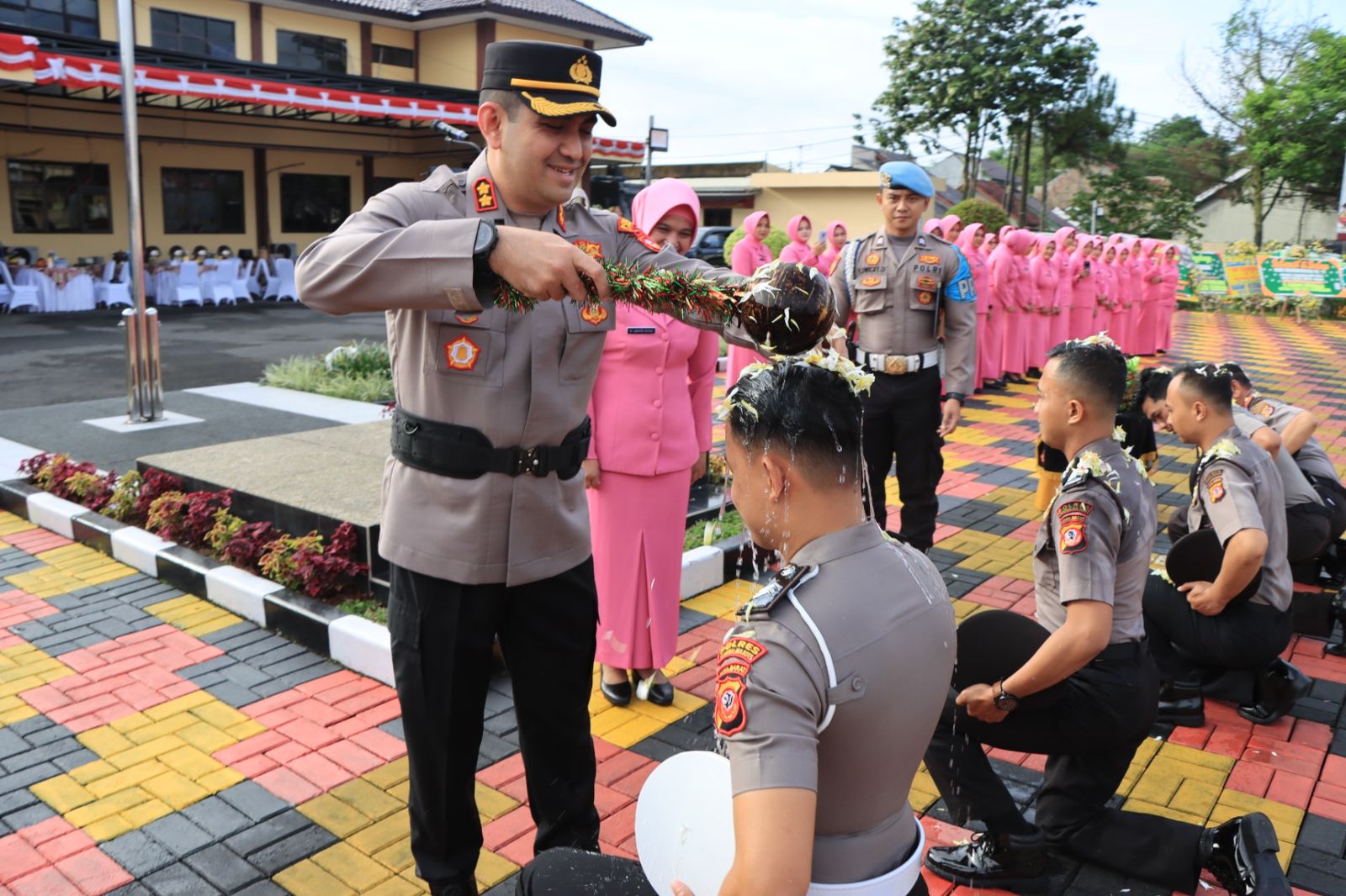 Selanjutnya kegiatan tradisi penyiraman air kepada 40 personel yang naik pangkat, diharapkan kenaikan pangkat menjadi kebanggaan secara personal maupun keluarganya, sehingga dapat meningkatkan kinerja yang profesional guna mewujudkan Polri yang Presisi. tegas AKBP SY Zainal Abidin.