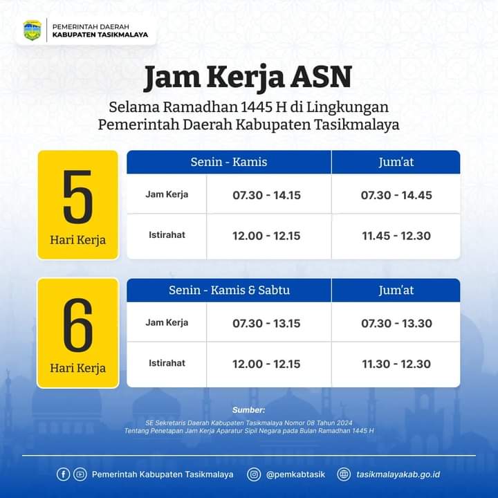 INOVATIF89.COM – Penetapan jam kerja Aparatur Sipil Negara (ASN) pada bulan Ramadan 1445 H?2024 M di lingkungan Pemerintah Daerah (Pemda) Kabupaten Tasikmalaya, berdasarkan Surat Edaran (SE) Sekretaris Daerah (Sekda) Kabupaten Tasikmalaya Nomor 08 Tahun 2024.