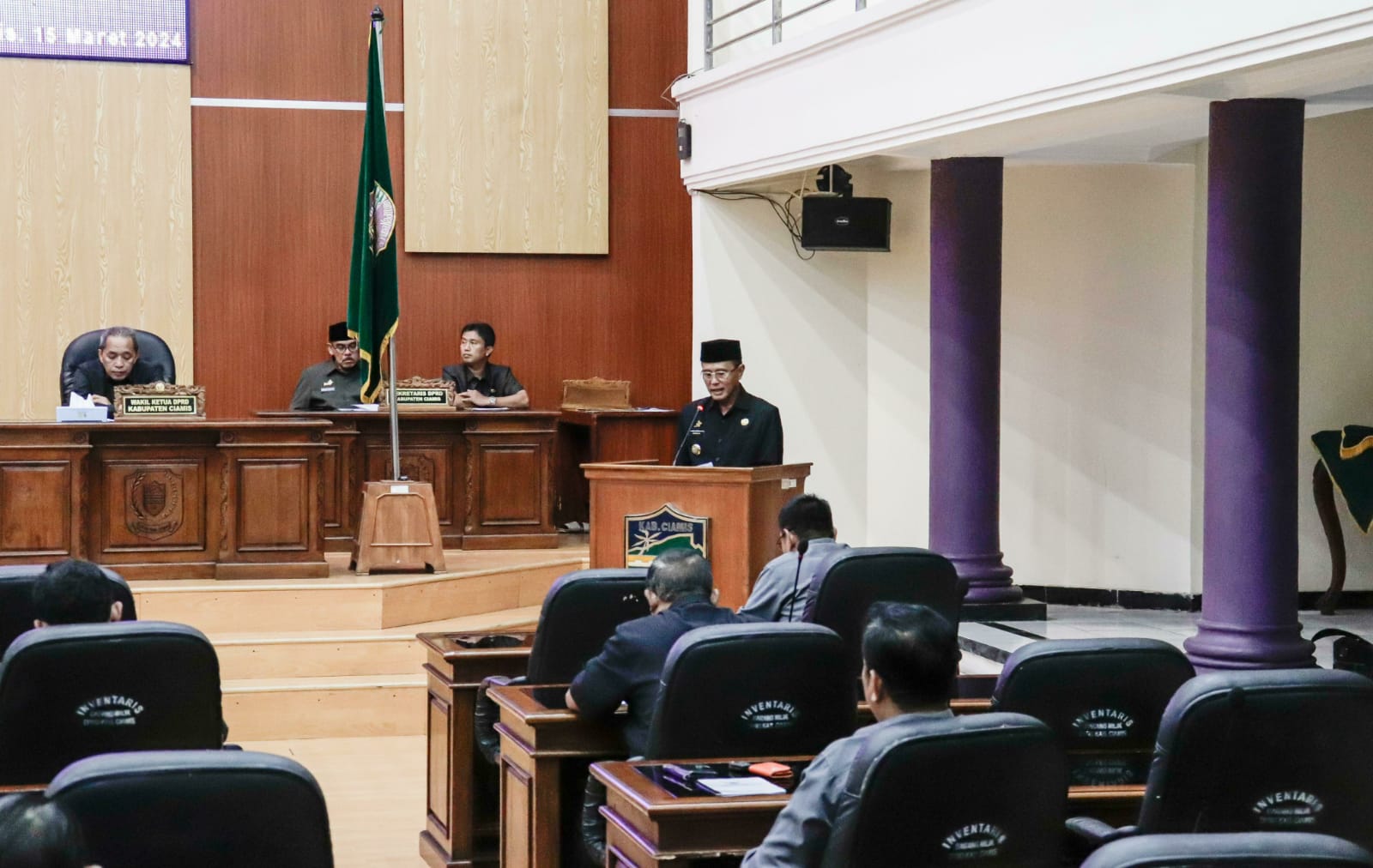 INOVATIF89.COM – Bupati Ciamis Dr. H. Herdiat Sunarya sampaikan Rancangan Awal (Ranwal) Rencana Pembangunan Jangka Panjang Daerah (RPJPD) Kabupaten Ciamis tahun 2025-2045, di Aula Tumenggung Wiradikusumah DPRD Kabupaten Ciamis, Jum’at (16/03/2024).