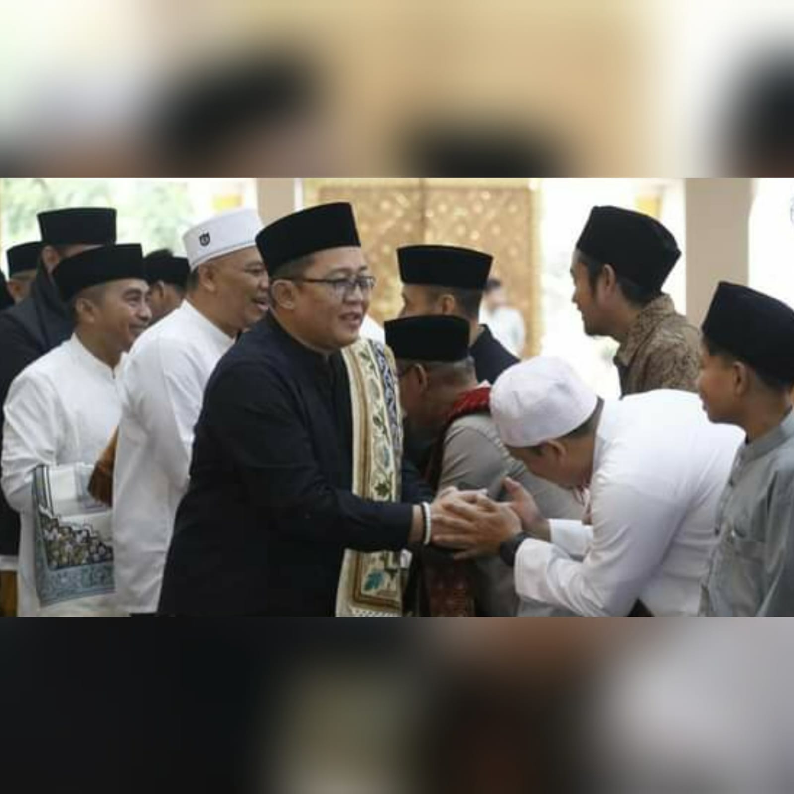Bupati Tasikmalaya H. Ade Sugianto, S.IP, bermushafahah dengan para jemaah Masjid Besar Baiturrahman usai melaksanakan Salat Idul Fitri