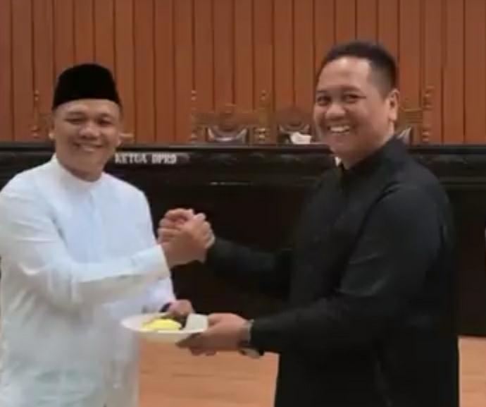 Ketua DPRD Kabupaten Tasikmalaya Asep Sopari Al-Ayubi SP (kiri) memerikan potongan tumpeng kepada Ketua Fraksi PDI Perjuangan, sebagai Anggota Komisi III DPRD Kabupaten Tasikmalaya Nanang Romli, S.IP