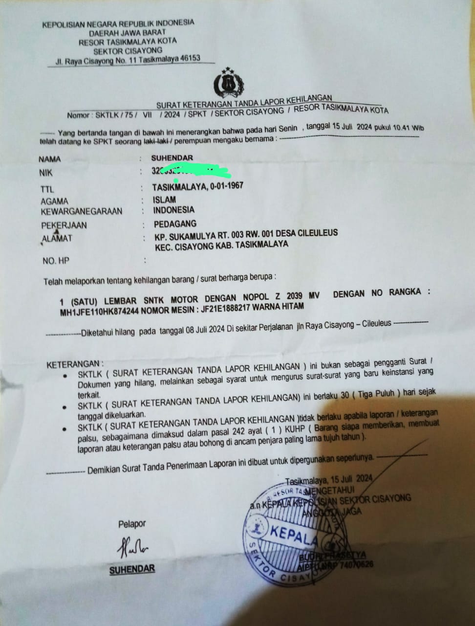 Kehilangan STNK ini sudah dilaporkan kepada Polsek Cisayong Polres Tasikmalaya Kota, nomor Surat Keterangan Tanda Laporan Kehilangan : SKTLK/75/VII/2024/SPKT/SEKTOR CISAYONG/RESOR TASIKMALAYA KOTA.