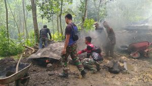 Gotong Royong Bersama Warga, Babinkamtibmas Desa Cikondang Bersihkan Longsoran Tanah