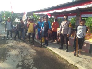 Persiapan Memperingati HUT RI ke -77, Bhabinkamtibmas Bersama Warga Kelurahan Setiajaya Gotong Royong Jum’at Bersih dan Pasang Umbul-umbul